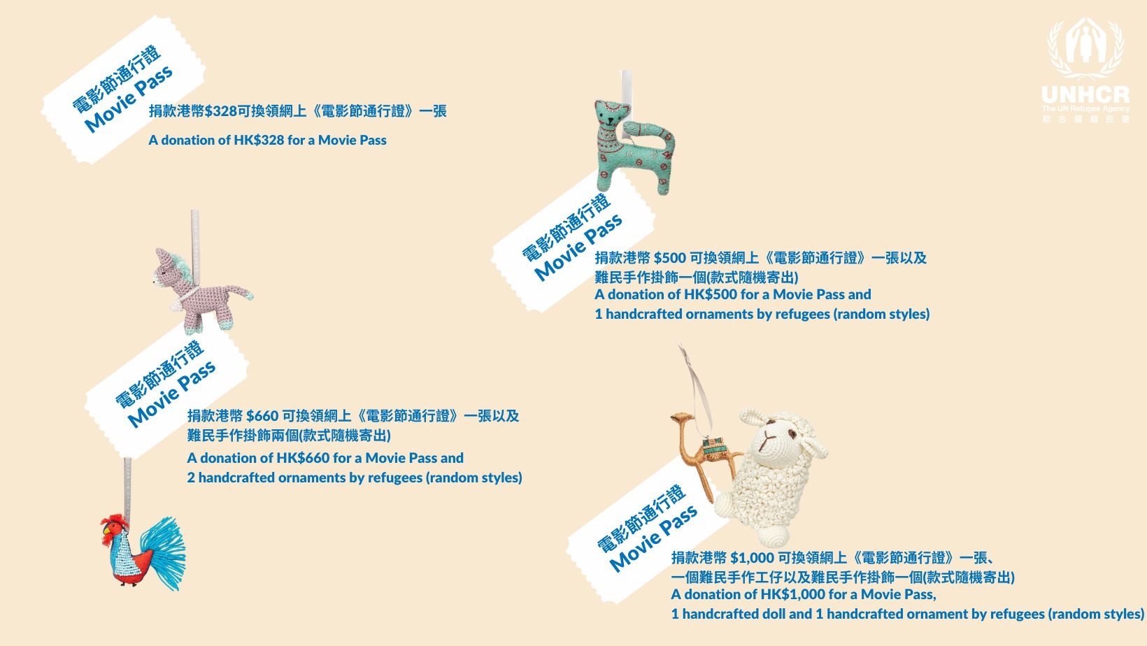 捐款港幣 $1,000 可換領網上《電影節通行證》一張、一個難民手作工仔以及難民手作掛飾一個(款式隨機寄出)