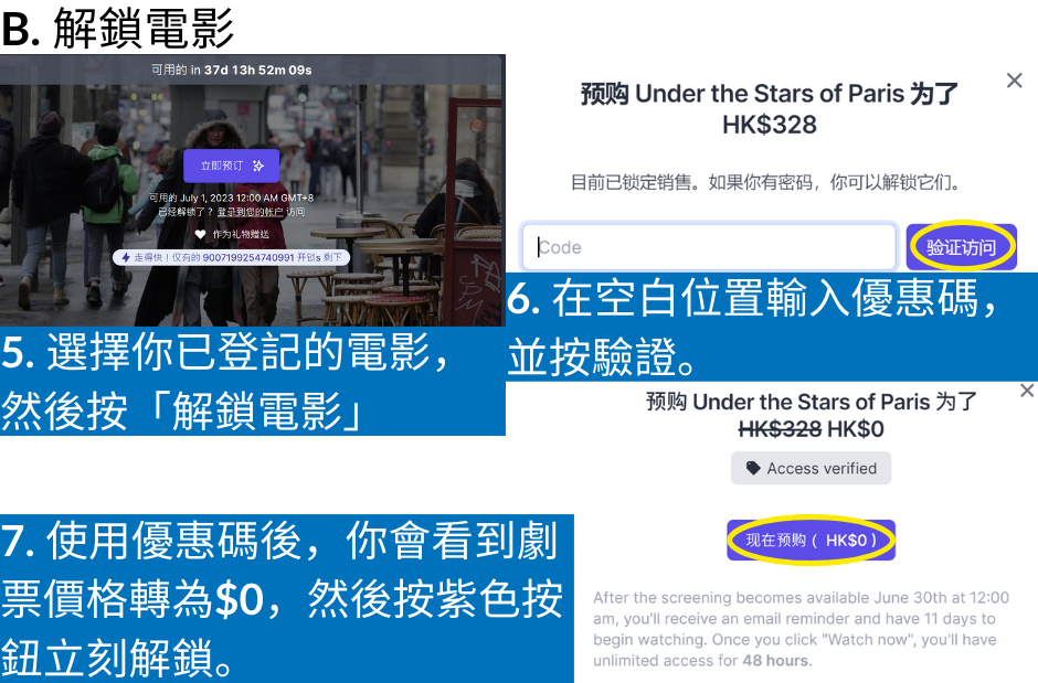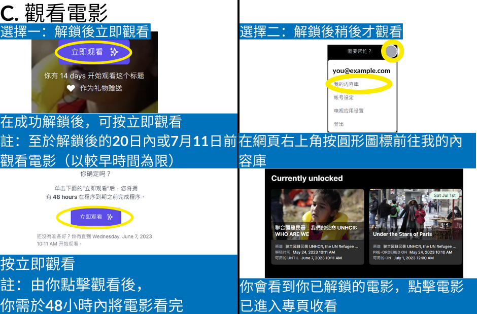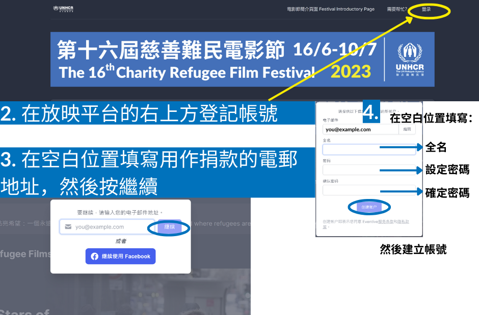 網上捐款成功後,你將會即時收到我們的捐款確認電郵,我們會為你提供可免費觀看電影的網上觀看碼。你只需要按照以下指示(你也可以查看捐款確認電郵的附件)進入指定連結,並輸入你用作捐款的電郵地址及你收到的觀看碼,即可在電影節期間(2023 年 6 月 16 日至 7 月 10 日)任何自選時段內在網上觀看影片。