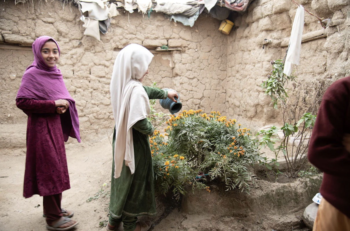 兩名年輕的阿富汗女孩在巴基斯坦澆花。未能就學的女孩特別容易遭受性別暴力。 © UNHCR/ R. Mirza