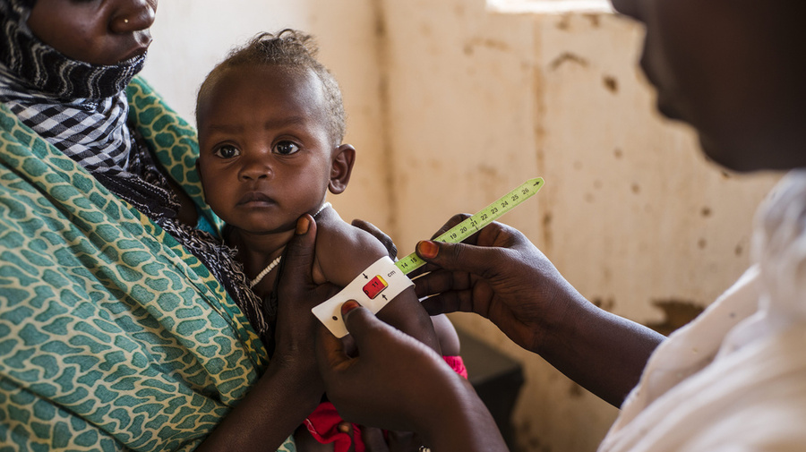 一名蘇丹的難民兒童正在Iridimi難民營中的營養中心進行評估,在Iridimi難民營中5歲以下營養不良的兒童佔13.67%。©UNHCR/ C.Fohlen 攝