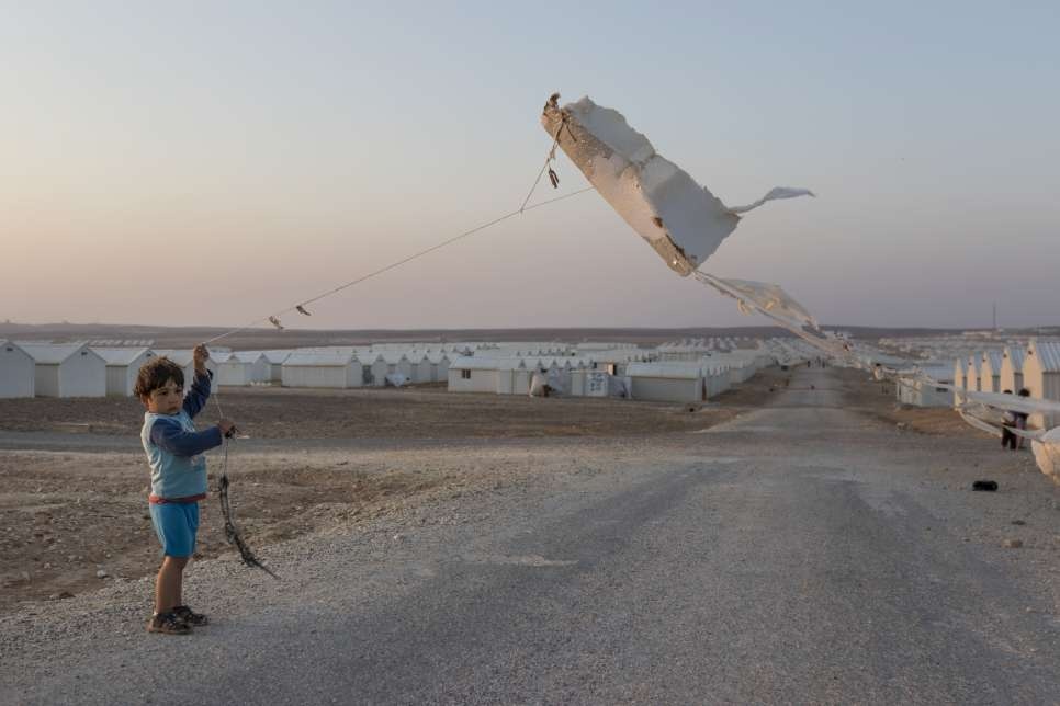 • 一名敍利亞男孩正於約旦的Azraq難民營,放著用絕緣材料製作的風箏。© UNHCR/Christopher Herwig
