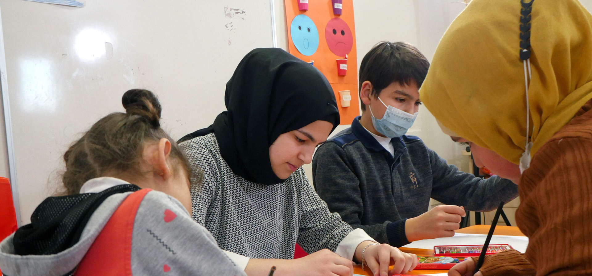 老師和受過訓練的輔導員經常以藝術作為一種自我表達和反思的方法,在他們的指導下,孩子們能夠分享他們對家鄉的感受,並表達他們對敍利亞未來的希望。