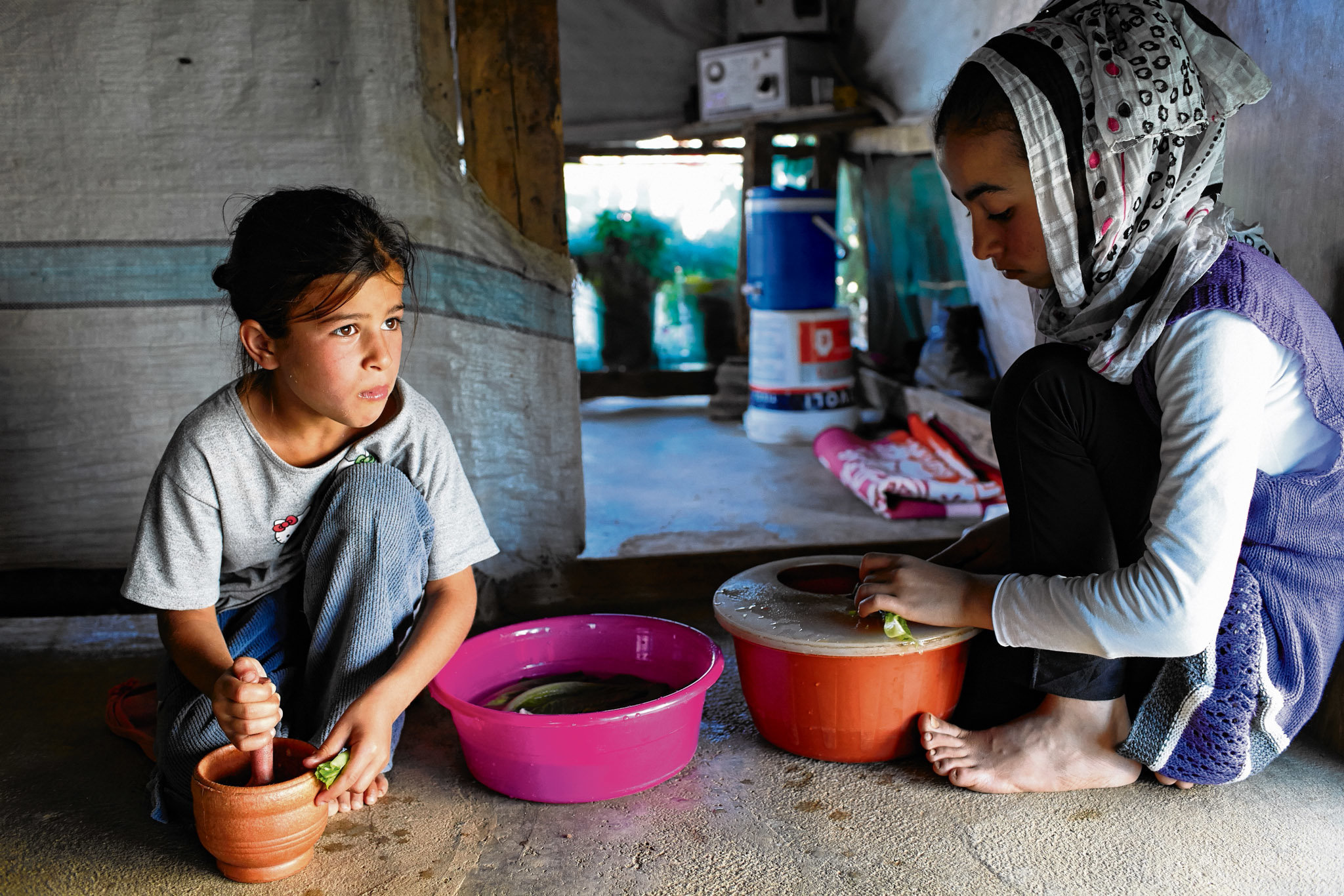 Aya(左)正與其中一名姐姐(右)準備晚飯。雖然他們每月均會獲聯合國難民署發放食物券,但份量卻只夠維持大半個月的需求。© UNHCR / S. Baldwin