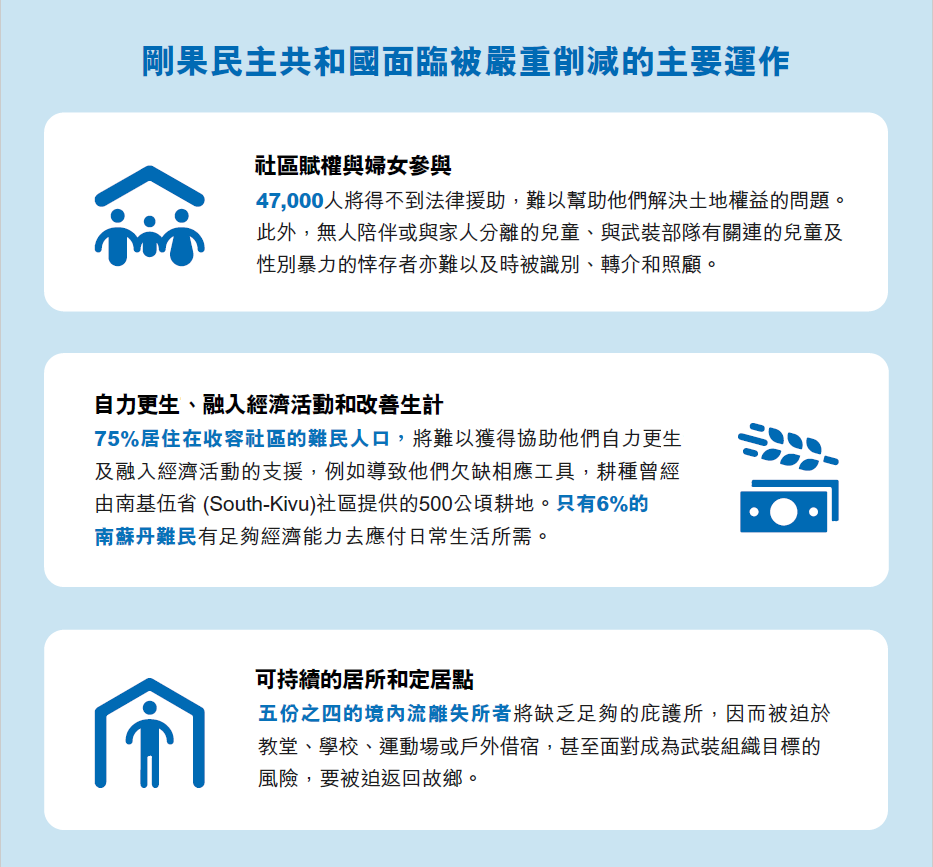 面對這場既可怕又長期持續的危機,人道救援的資金卻嚴重不足。假如現時有更多資金去幫助當地的難民,以及在國外的剛果難民,協助他們返回原籍國,那麼就可以避免將來花費更多的人道救援成本。