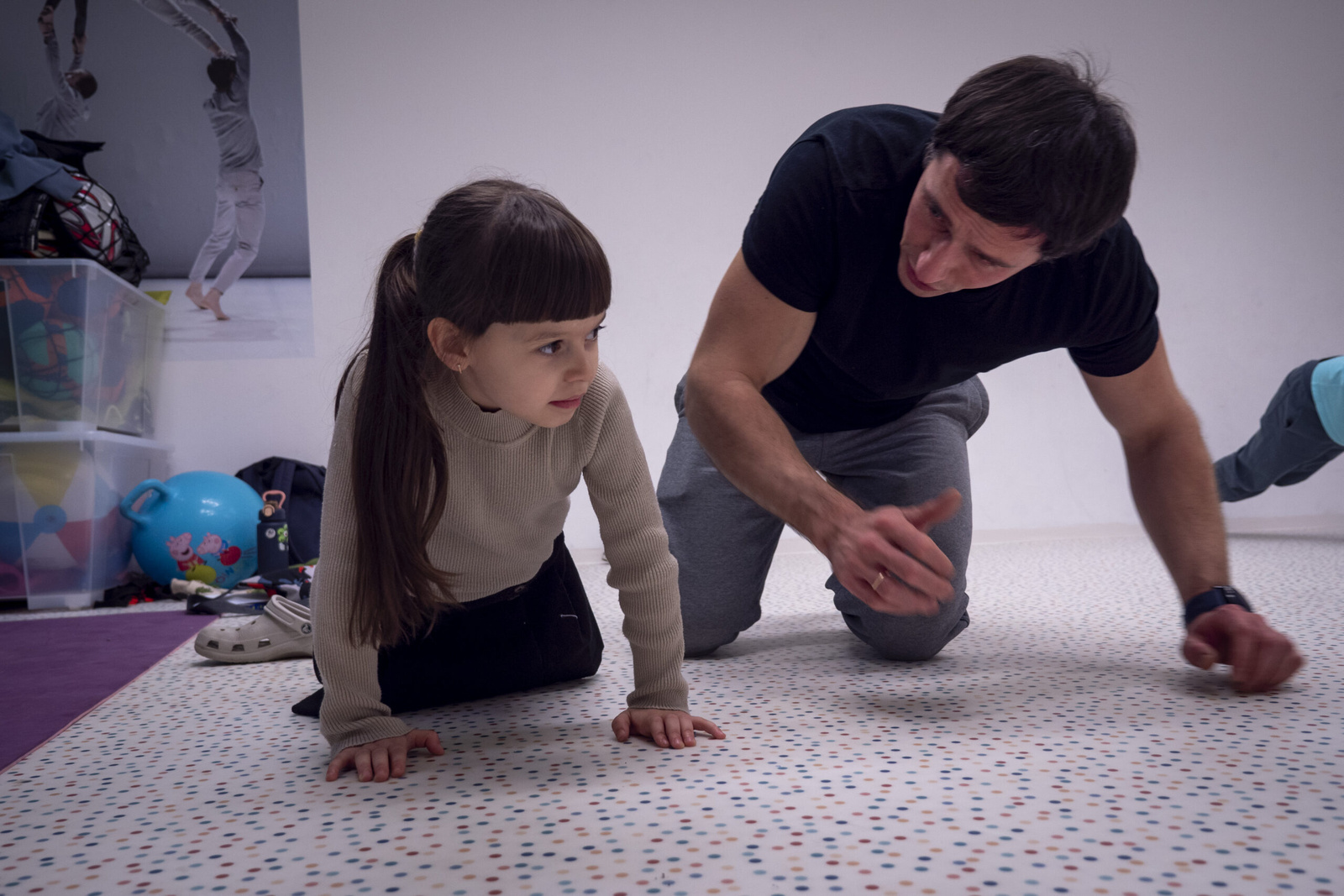 Néhány nehezebb erőnléti gyakorlat következik az ukrán gyerekekkel, és Olekszandr nagyon gyengéden kiigazítja egy, a fekvőtámasszal küszködő kislány testtartását.