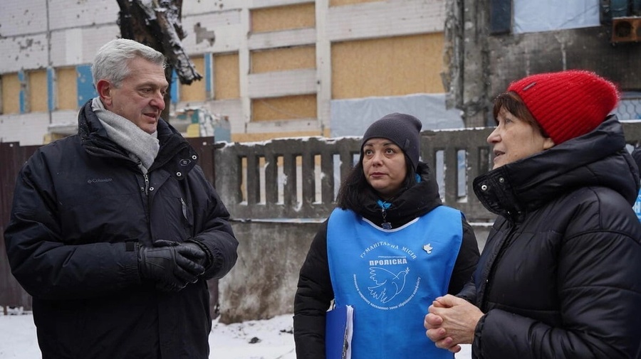 Az ENSZ menekültügyi főbiztosa, Filippo Grandi és az ukrajnai Proliszka segélyszervezet egyik munkatársa Szvitlanával beszélgetnek, akinek a dnyiprói otthona a 2023. december 29-i rakétatámadásban kapott találatot. © UNHCR/Iryna Tymchyshyn