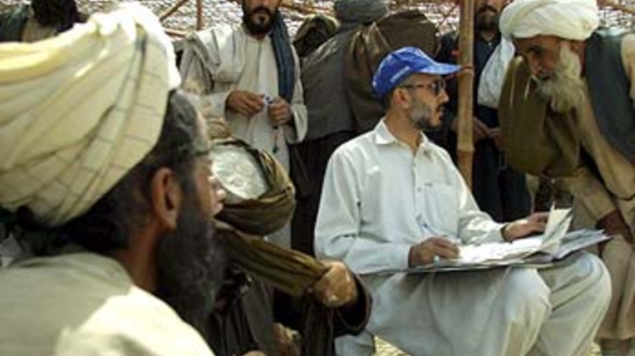 A UNHCR worker registers Afghan refugees in the makeshift Chaman camp.