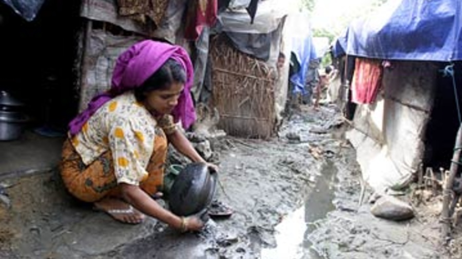 A Rohingya refugee woman cleans her ustensils in dirty and unsanitary conditions in Bangladesh.