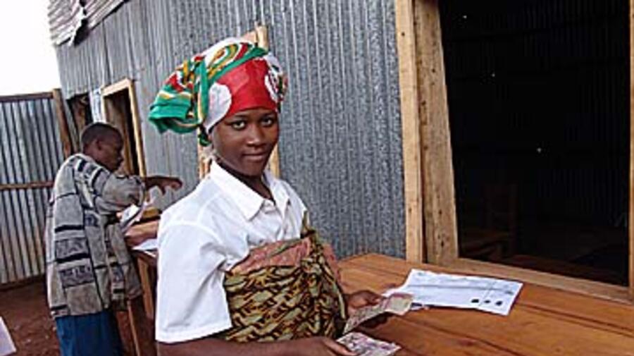 A returnee receives the first nstalment of her cash grant at a transit centre in Burundi.