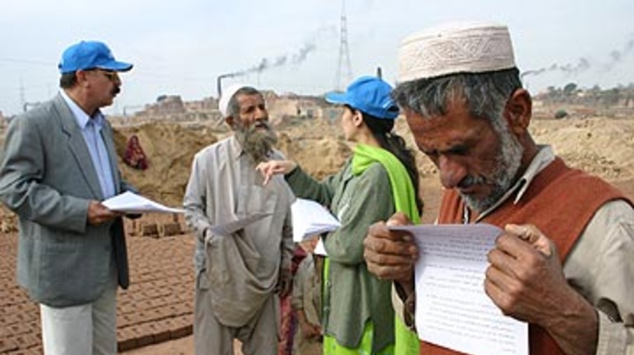 UNHCR staff discuss the census with Afghans working in brick factories near Islamabad.
