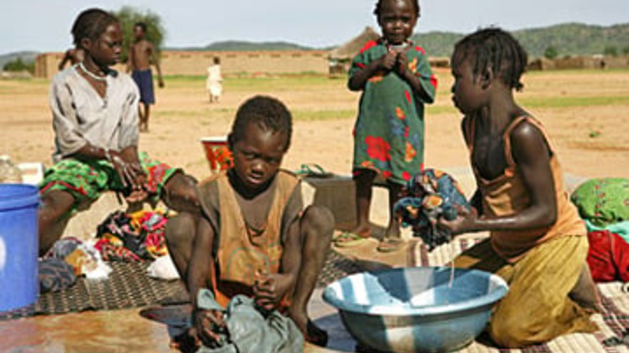 Refugee children wash their families' clothes in Djabal camp. Many children are overwhelmed with daily chores and as a result attend school only sporadically.