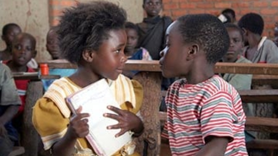 In a class in one brick-walled school, young boys and girls take turns standing in front of their fellow students to do role-plays of a meeting between two French-speaking Congolese: shouting greetings at one another, they act out something that may well be their daily reality before too long.