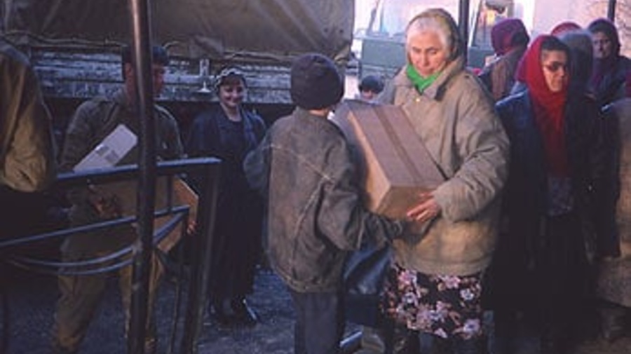 Displaced Chechens at Sleptsovkoye distribution centre are among the 110,000 living in Ingushetia.