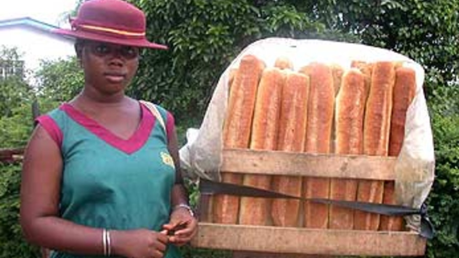 Liberian refugee Zinnah Mansally – in UNHCR-sponsored school uniform – selling bread after school in Freetown.