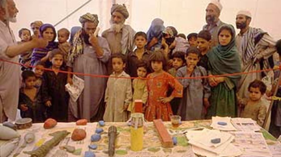 Afghan returnees go through mine-awareness training at Kabul's Pul-i-Charkhi distribution centre.
