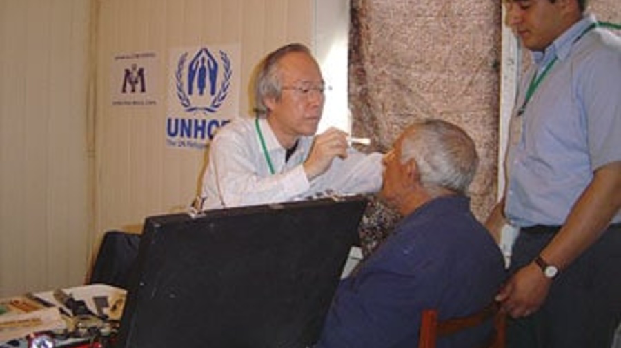Fuji Optical President Dr. Akio Kanai examining the eyes of vulnerable people in Azerbaijan.