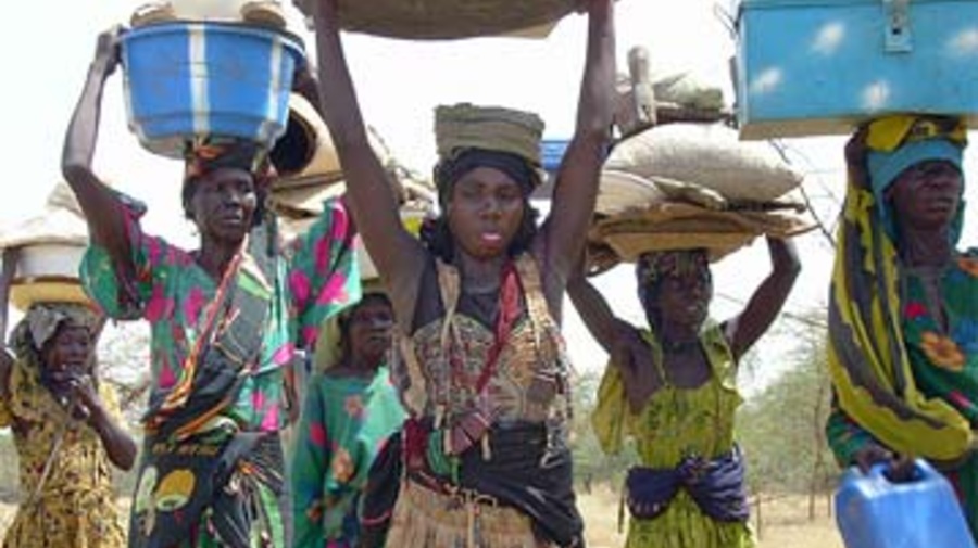 Displaced Chadian women walk near Goz Amer refugee camp after retrieving belongings from their village. High Commissioner António Guterres hopes to meet displaced Chadians.