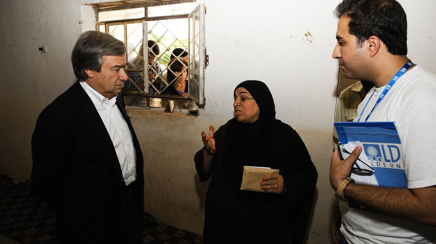 High Commissioner António Guterres talks to an Iraqi refugee in Al Hassakeh before taking part in the live event.
