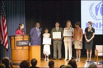 Secretary Rice and Goodwill Ambassador Jolie presented awards to three winners of the 4th Annual World Refugee Day Poster Contest, which Jolie sponsors. This year's winners were: Jessica Shenoi from Tulsa, Oklahoma; Vicente Echevarria from Des Plaines, Illinois; and Katherine Ricker from Phoenix, Arizona. Admiring the posters, Rice said, "The young poster contest winners we applaud today have answered the call of conscience in an exceptionally creative way."