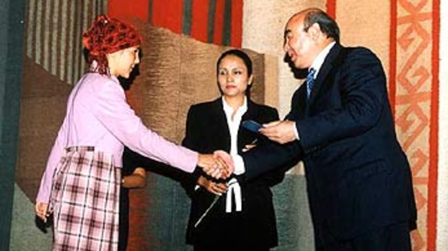 Kyrgyzstan's President Askar Akaev congratulates a Tajik refugee on receiving her Kyrgyz passport and citizenship.