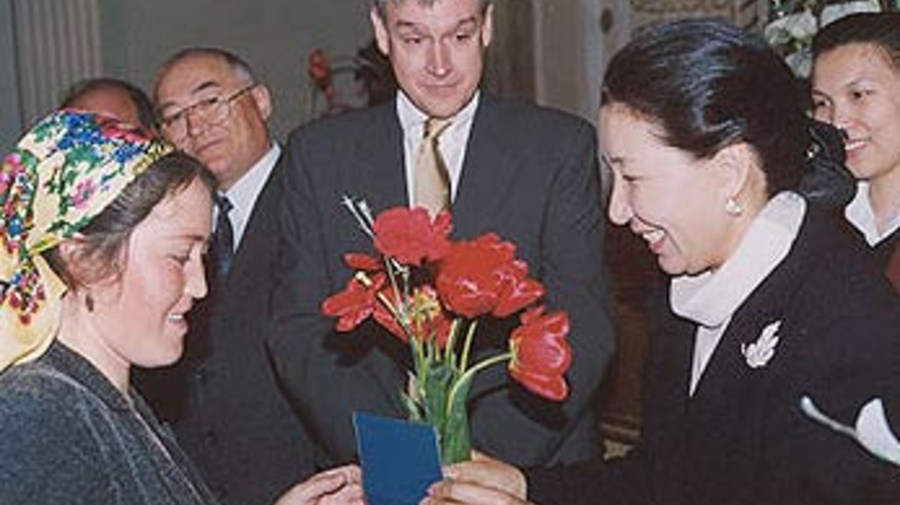 Kyrgyzstan's First Lady, Professor Mairam Akaeva, handing out passports to Tajik refugees in a ceremony in April.