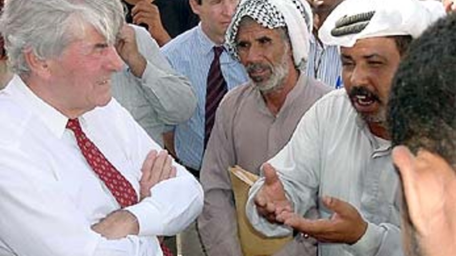 High Commissioner Ruud Lubbers with Iranian refugees at a transit centre outside Basra. Harassed in their settlements in Southern Iraq yet refused entry back into Iran, these refugees have been stranded near the border for months.