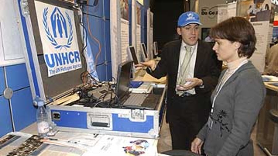 Demonstrating the refugee registration system developed by Microsoft at the UN World Summit on the Information Society in Geneva.