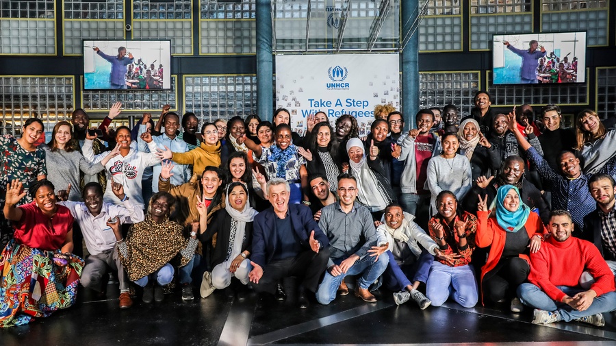 UN High Commissioner for Refugees Filippo Grandi meets a group of refugees attending the Global Refugee Forum in Geneva.