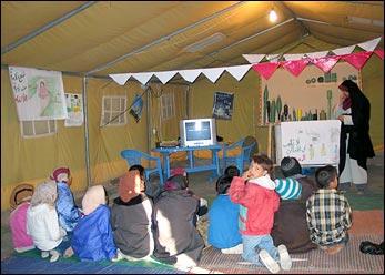 Iraqi refugee children receive mine-awareness training before crossing back to Iraq from Iran.
