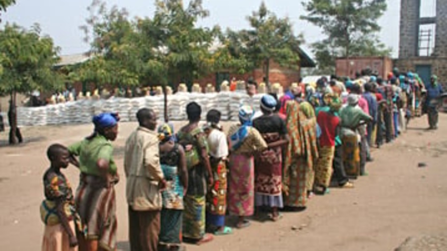Displaced people queue up for assistance at the church in Kiwanja, North Kivu.