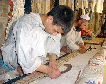 Sources say Afghans working in the carpet weaving setups at Attock earn an average of 2,500 rupees (US$41) for weaving a piece measuring one square foot.