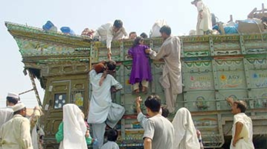 An Afghan family climbs onto the truck home from Attock near Islamabad.