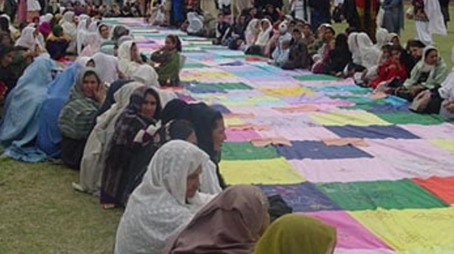 The refugee women, mainly living in the Peshawar and Rawalpindi regions of Pakistan, arrived early in the day at the stadium in Islamabad, each carrying a piece of cloth with embroidery, patchwork, paintings or text messages about the role women want to play in the new Afghanistan. The pieces of cloth were later stitched together into a colourful banner, 90 metres long and 2 metres wide, and sent to the Afghan capital. The refugee women say the banner is a symbol of the peace and stability they yearn for in their country.