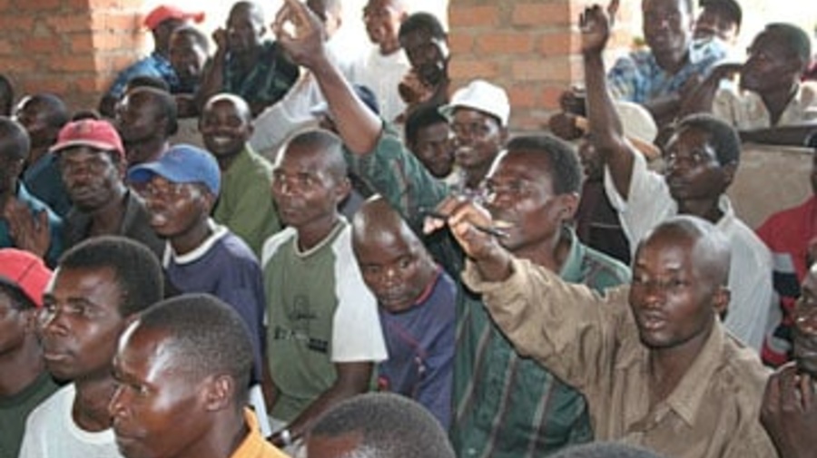 Congolese refugees in Mwange camp at a meeting with UNHCR officials and visiting members of their government.