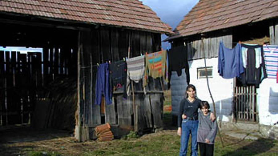 Milana and her younger sister, Dragana, in the farmyard of their home in Majske Poljane, which means "Meadows of May." UNHCR/Andrej Mahecic