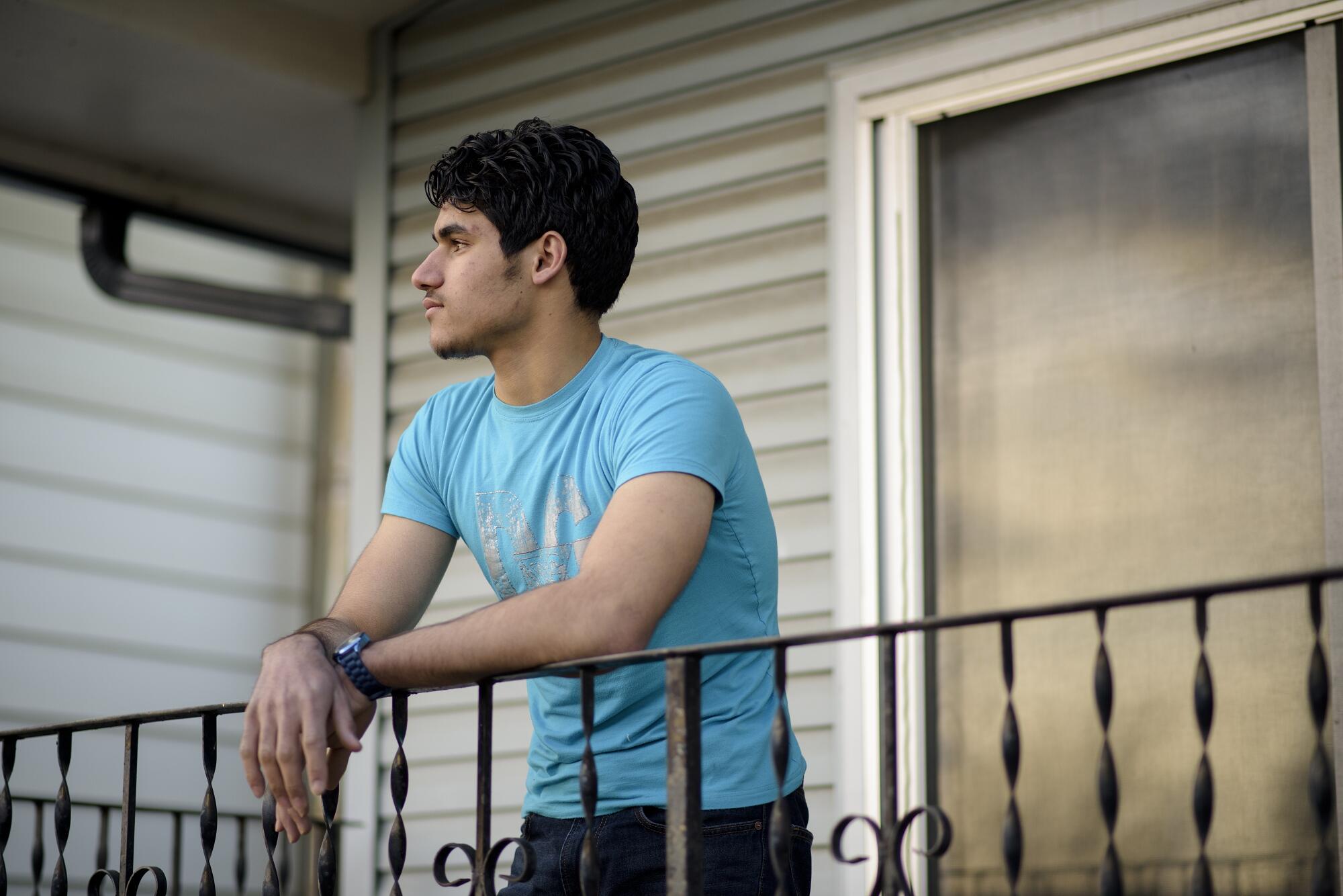 Syrian refugee Mohamad Al Kawarit stands on the balcony of his family's new home in Calgary, Canada.