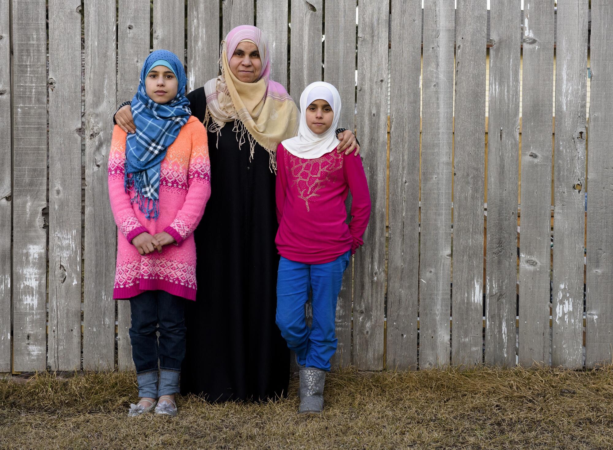 Syrian refugee mother, Souad Tawfic Al Nouri, stands with her daughters in the yard of their family's new home in Calgary, Canada.