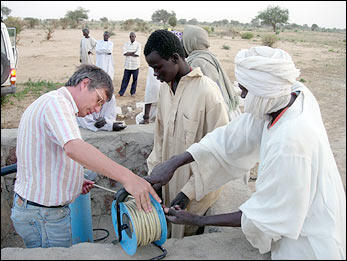 UNHCR's water expert tests the depth of the water level at a new borehole in Iridimi camp, where the water table is decreasing much faster than foreseen.