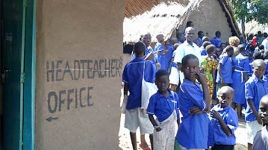Sudanese refugee children join the local children at Biyaya Primary School in Adjumani, northern Uganda. Primary education is free for refugees in the northern settlements.