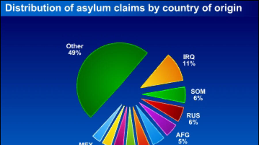 Top 10 origin countries: Iraq, Somalia, Russian Federation, Afghanistan, China, Serbia, Nigeria, Pakistan, Eritrea, Mexico.