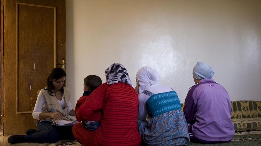 Outreach worker registering a displaced Syrian family in Lebanon.