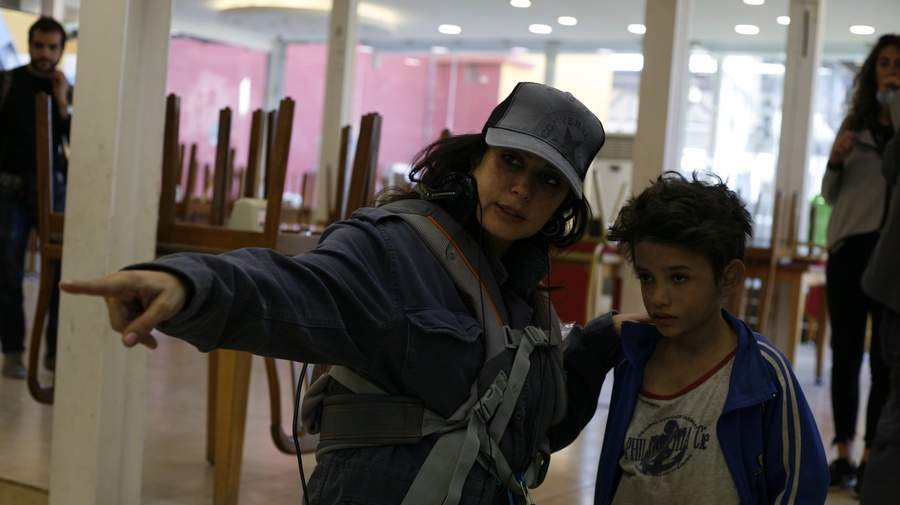 Director Nadine Labaki and Syrian refugee lead actor Zain Al Rafeea filming Capernaum.