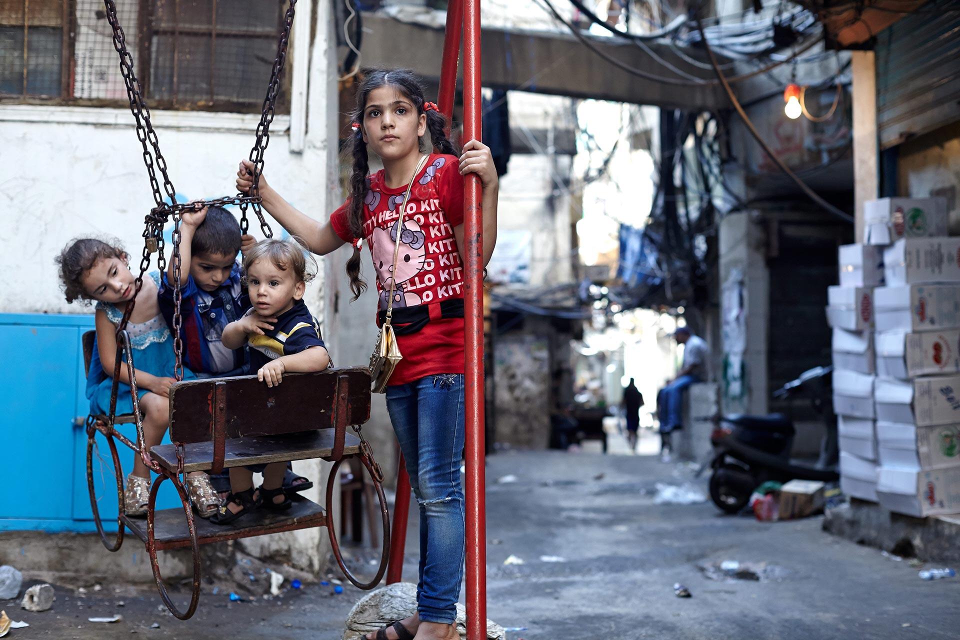 Rahaf, 10, plays with her younger siblings in Shatila, a poor neighbourhood in Beirut. She hasn't been to class since the day a bomb fell on her school in Syria, killing 13 fellow students.