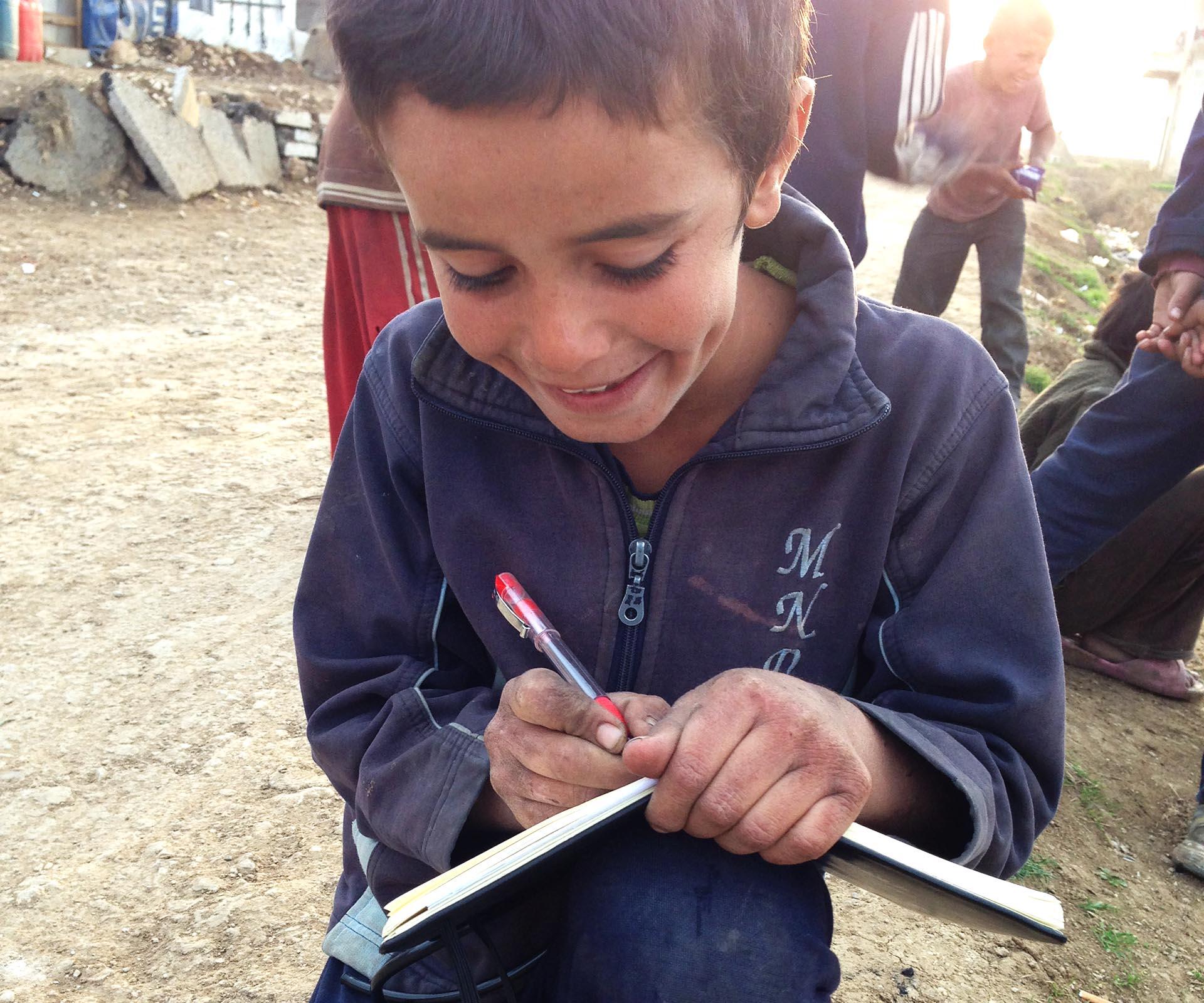 Nawfal, 8, writes a message in the author's notebook. It reads, in part, "I love school so much. I want to go back to Syria."
