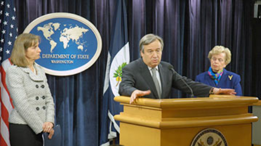 High Commissioner António Guterres at a press conference in Washington with Under Secretary of State Paula Dobriansky (left) and Assistant Secretary of State Ellen Sauerbrey.