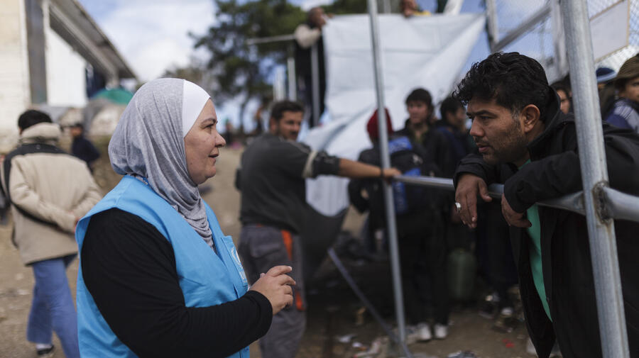 Huda Al-Shabsogh, a UNHCR field officer working with unaccompanied minors on the Greek island of Lesbos, chats to a refugee at the Moria Reception and Registration Centre.