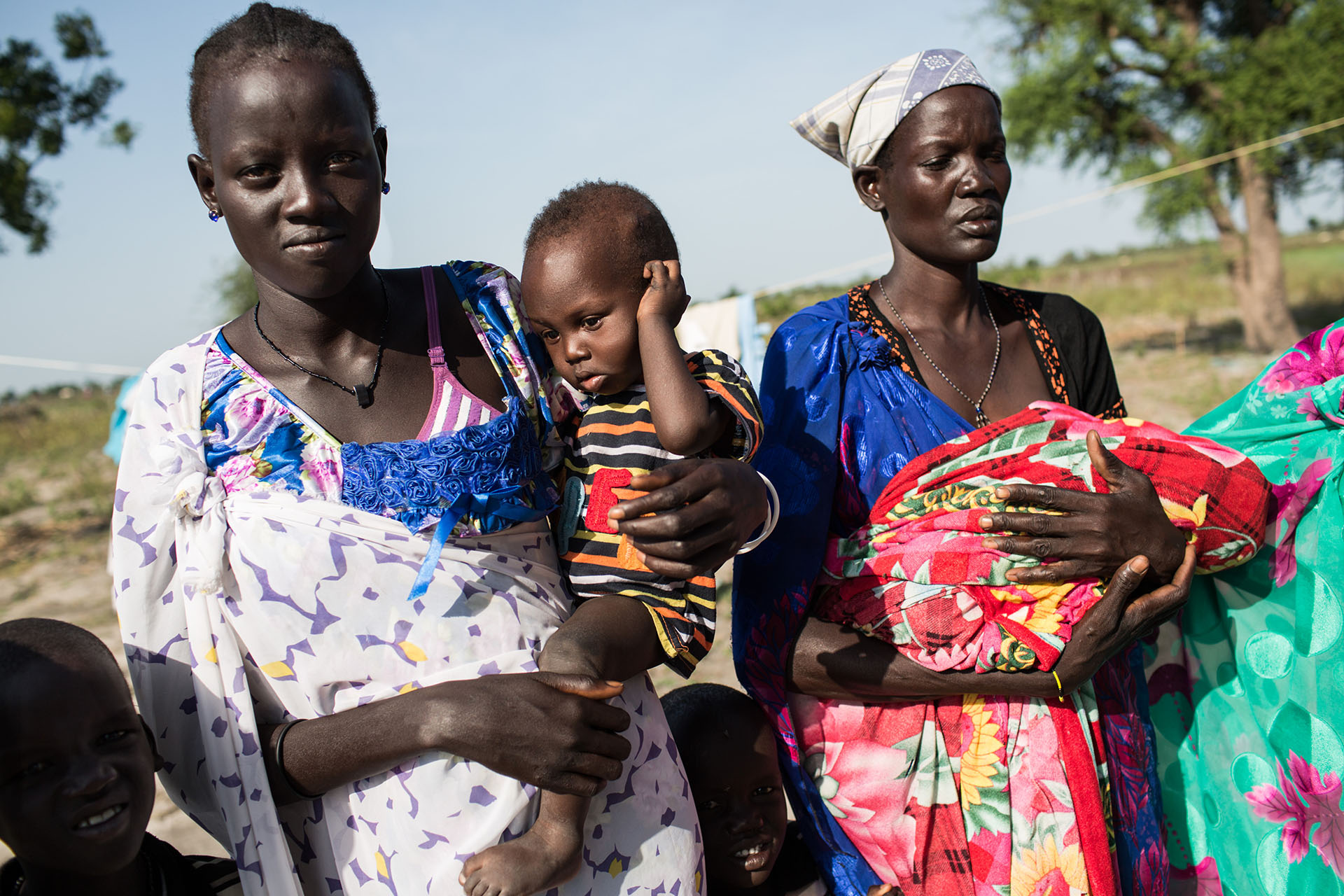 Nyathay (left) and Nyaruach hold two of their young children outside the home of a stranger who invited them to stay for the night in Leer, Unity State, South Sudan.