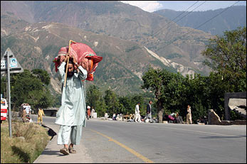 An earthquake victim in Mansehra, Pakistan, carries his worldly possessions on his back.