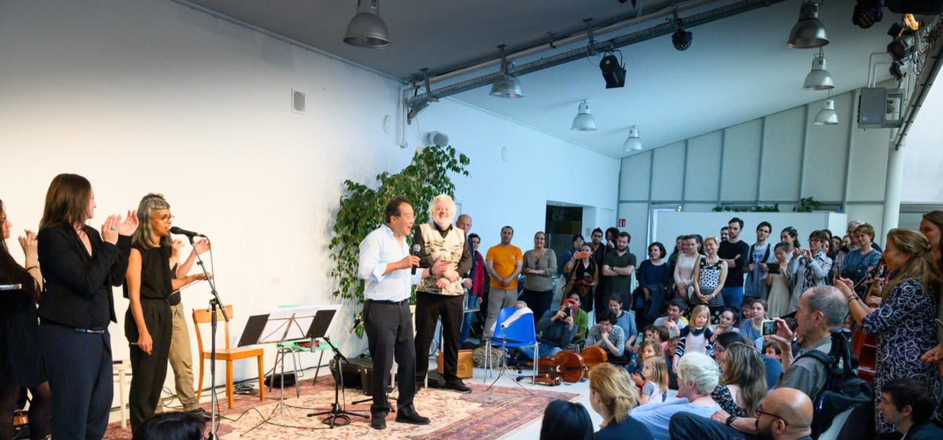 The workshop with Ma was dedicated to diversity and social inclusion. Eighty participants including 10 refugees learned and performed “Lamma Bada Yatathana”, the song in Arabic from medieval Spain that Basma was rehearsing.