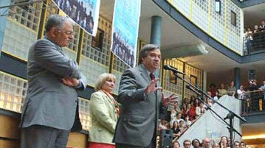 "António is a man who cares about refugees and people of asylum," said Chamberlin, presenting him to staff gathered in the agency's atrium. "He has a long history of showing this care, by teaching refugees mathematics in evening classes on his own time and by establishing the Portuguese Refugee Council in 1991. As Portugal's Prime Minister, he galvanised the international community to help East Timor in an emergency."